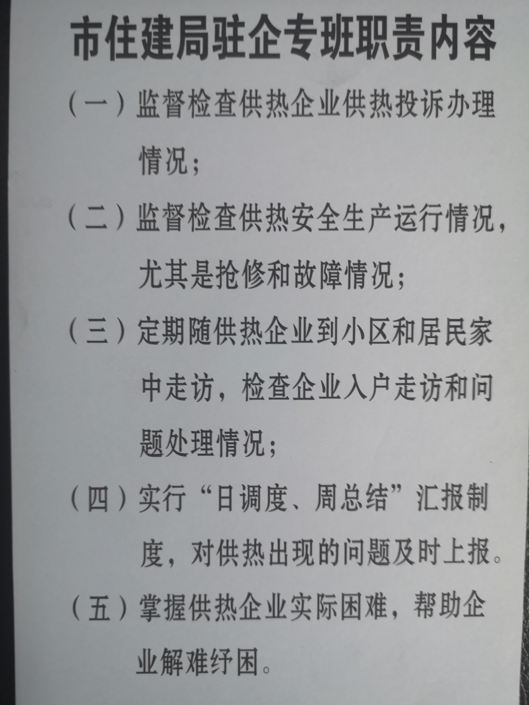 二是落实包保责任。针对全市供热企业运行情况,采取定点包保方式,副市长刘立新和市住建局局长卢晓峰包保亿斯特公司,丰满区委书记李铁包保建华供热公司,协助企业解决融资贷款、账户解封等问题。吉林市供热行业主管部门共抽调42人入驻城区21户供热企业,紧盯企业煤炭采购、投诉办理、设备检修、安全生产、存在问题等关键环节,推动企业认真履行供热保障主体责任。