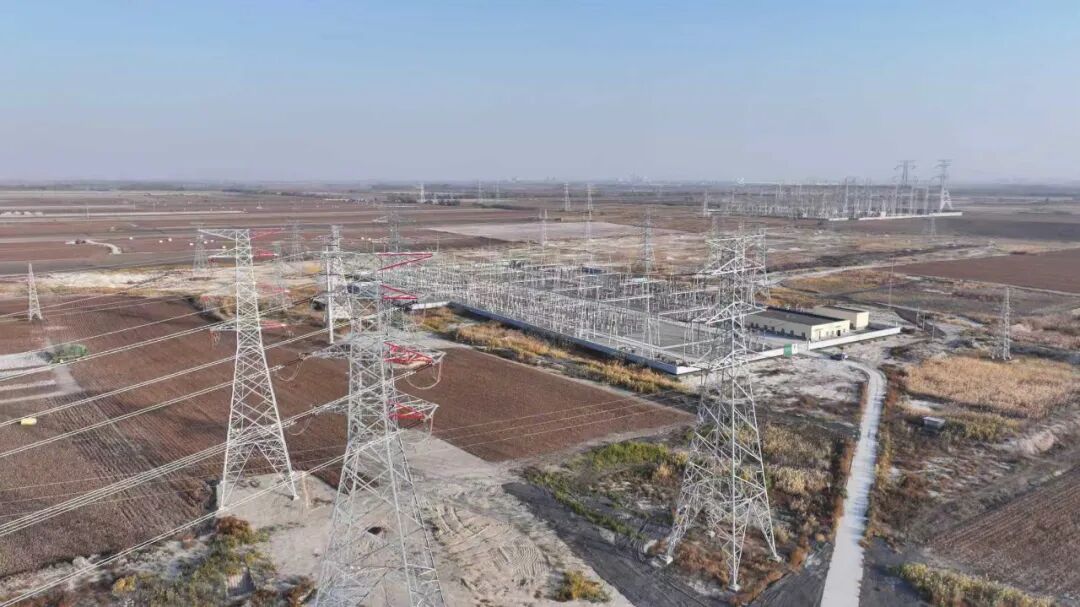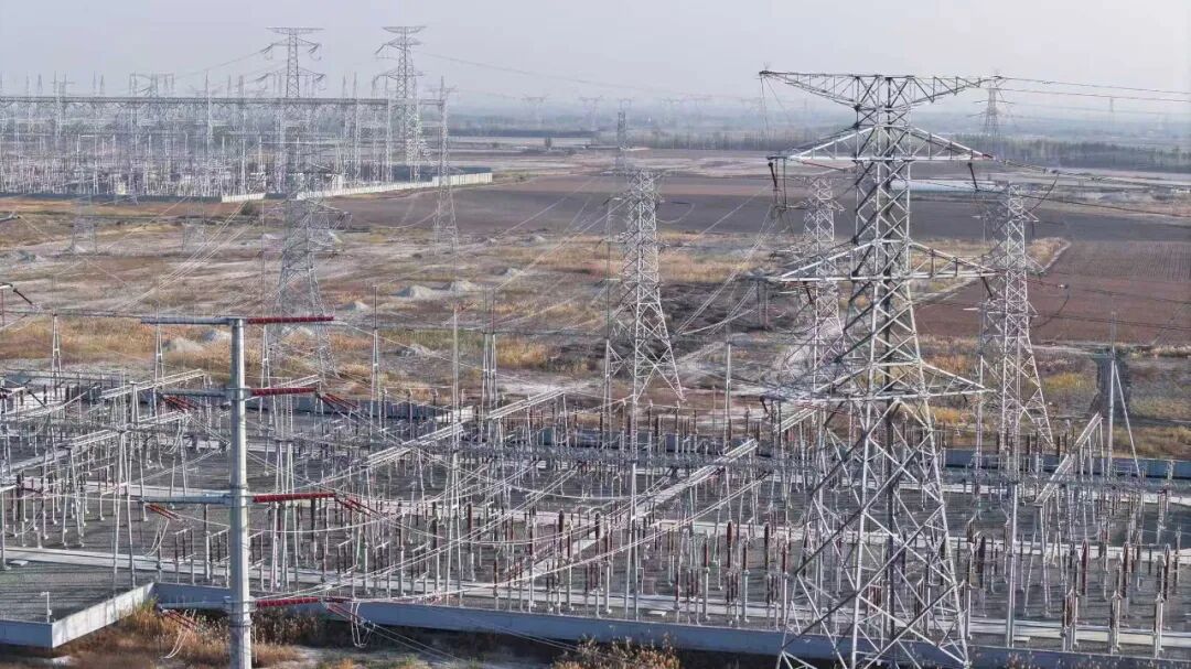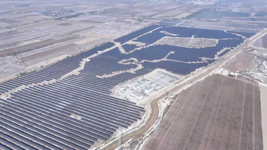 俯拍新疆天富绿能光伏发电有限责任公司220kV永安汇集站。