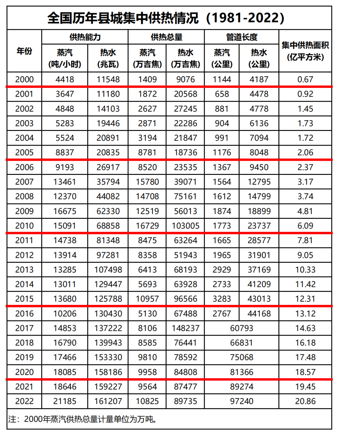 2023年10月13日,住房和城乡建设部发布《2022年城市建设统计年鉴》和《2022年城乡建设统计年鉴》,公布了1981年至2022年全国历年城市集中供热情况以及2000年至2020年全国历年县城集中供热情况。