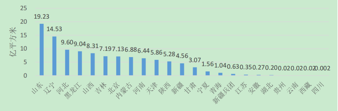 从行政分区看,山东和辽宁城市集中供热面积超过10亿平方米;河北、黑龙江、山西、吉林、北京、内蒙古、河南、天津和陕西8个省(区、市)超过5亿平方米;新疆、甘肃、宁夏和青海5个省(区)超过1亿平方米;江苏、安徽、湖北、贵州、云南、西藏、四川7个省(区)和新疆兵团不足1亿平方米;上海、浙江、江西、湖南、广西、福建、广东、海南和重庆9个省(区、市)无集中供热面积。