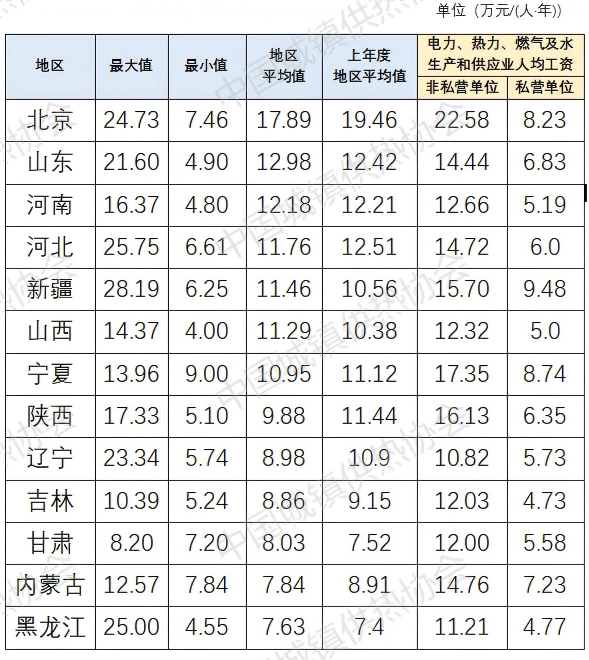 2025年协会共统计了105家供热企业2024年职工人均工资,平均值为10.91万元/(人·年)【上一年度平均值11.95万元/(人·年)】,分地区看,各地区平均值差异明显。北京以17.89万元/(人·年)位居首位;山东(12.98万元)、河南(12.18万元)、河北(11.76万元)、新疆(11.46万元)、山西(11.29万元)、宁夏(10.95万元)等地人均工资高于全国行业平均水平。