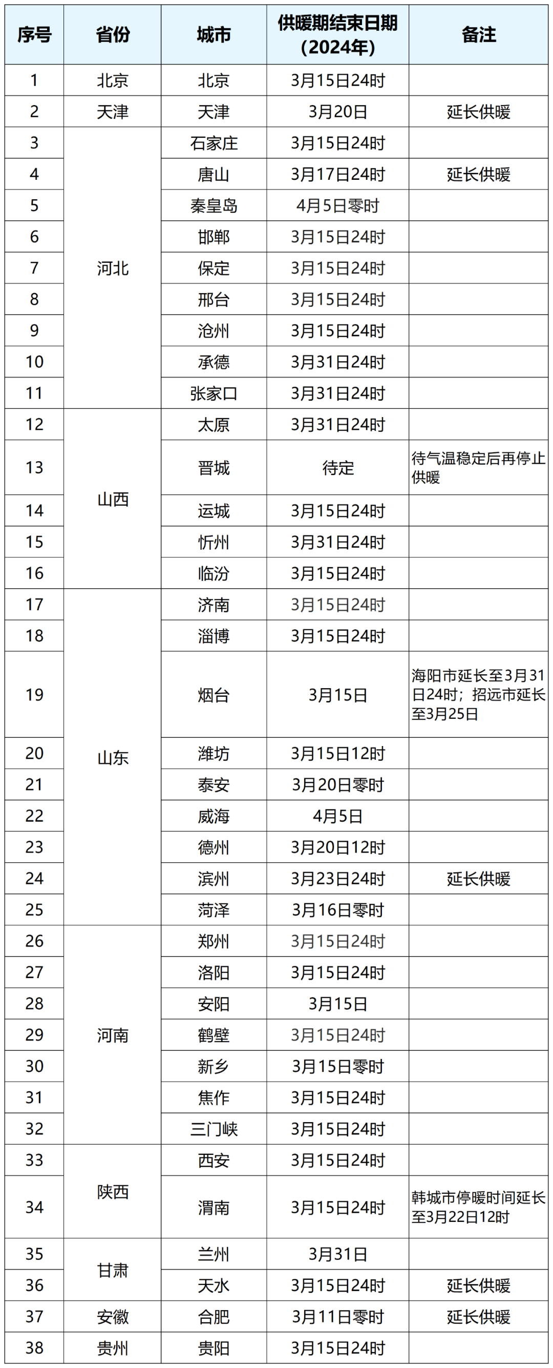 信息显示,天津、唐山、滨州、天水、合肥、渭南、烟台等地延长供暖时间,东北、内蒙、新疆、甘肃等严寒地区均未到法定停暖时间,暂未有相关停暖信息发布。