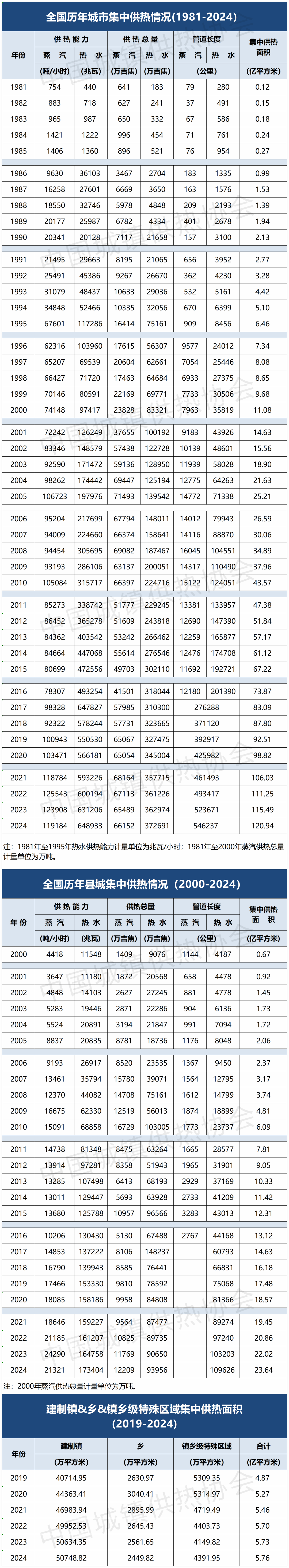 日前,国家住房和城乡建设部发布《2024年城市建设统计年鉴》《2024年城乡建设统计年鉴》,公布了1981年至2024年全国历年城市集中供热情况以及2000年至2024年全国历年县城集中供热等情况。