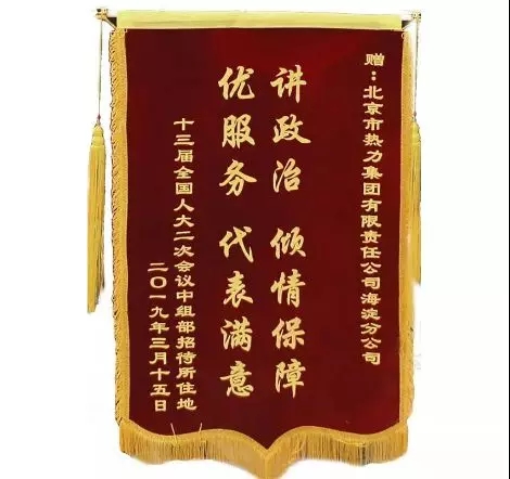 近日,中组部机关事务管理局领导到北京热力集团赠送了一面印有“讲政治倾情保障、优服务代表满意”的锦旗,感谢北京热力集团圆满保障了全国“两会”代表驻地的优质供热,并为患病代表提供了周到的供热服务。