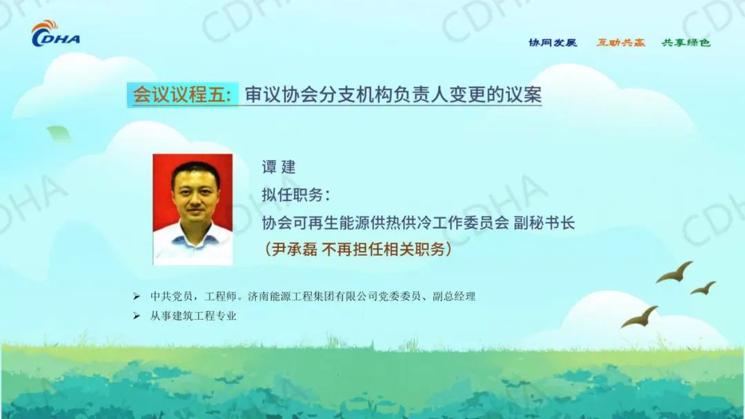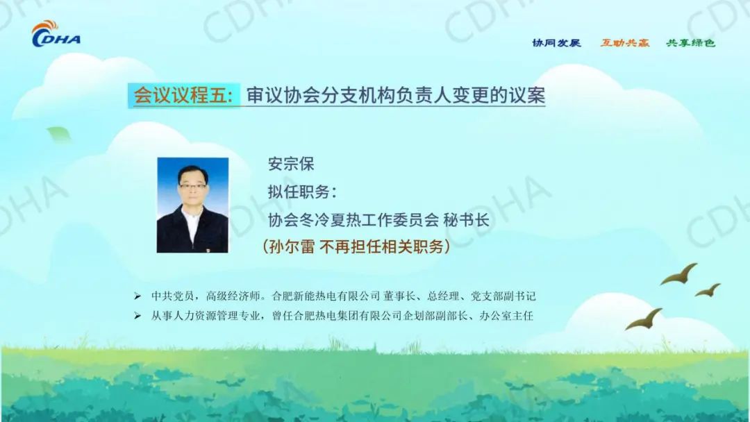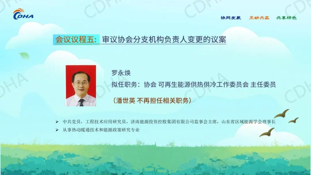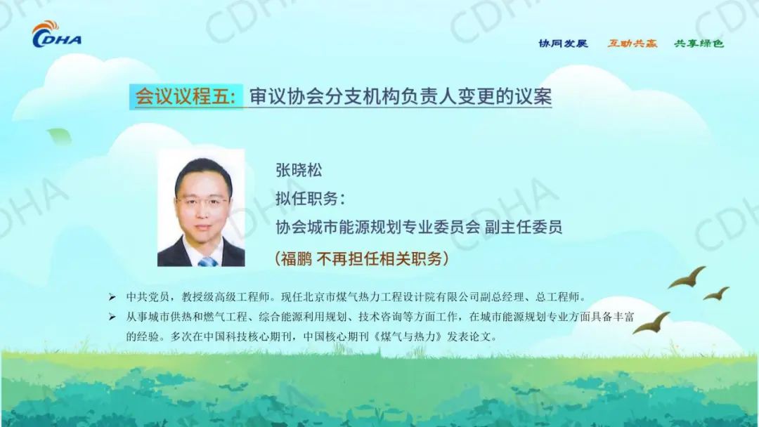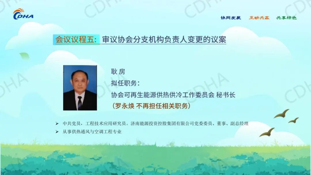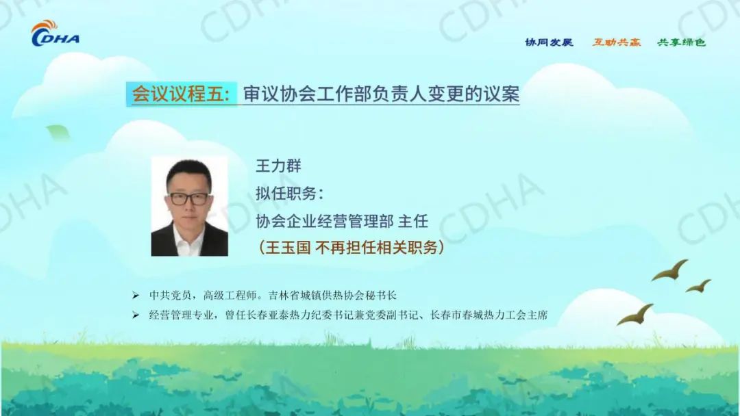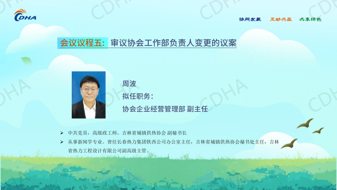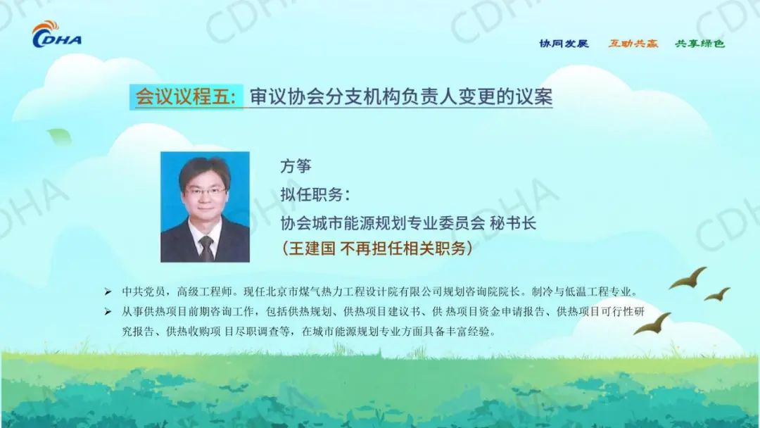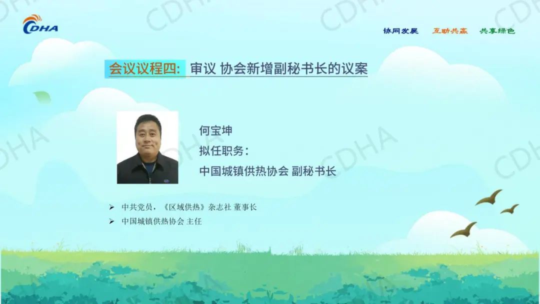 经会前审议投票表决,同意中国城镇供热协会秘书处主任綦京峰同志、《区域供热》杂志社有限公司董事长何宝坤同志任协会副秘书长。
