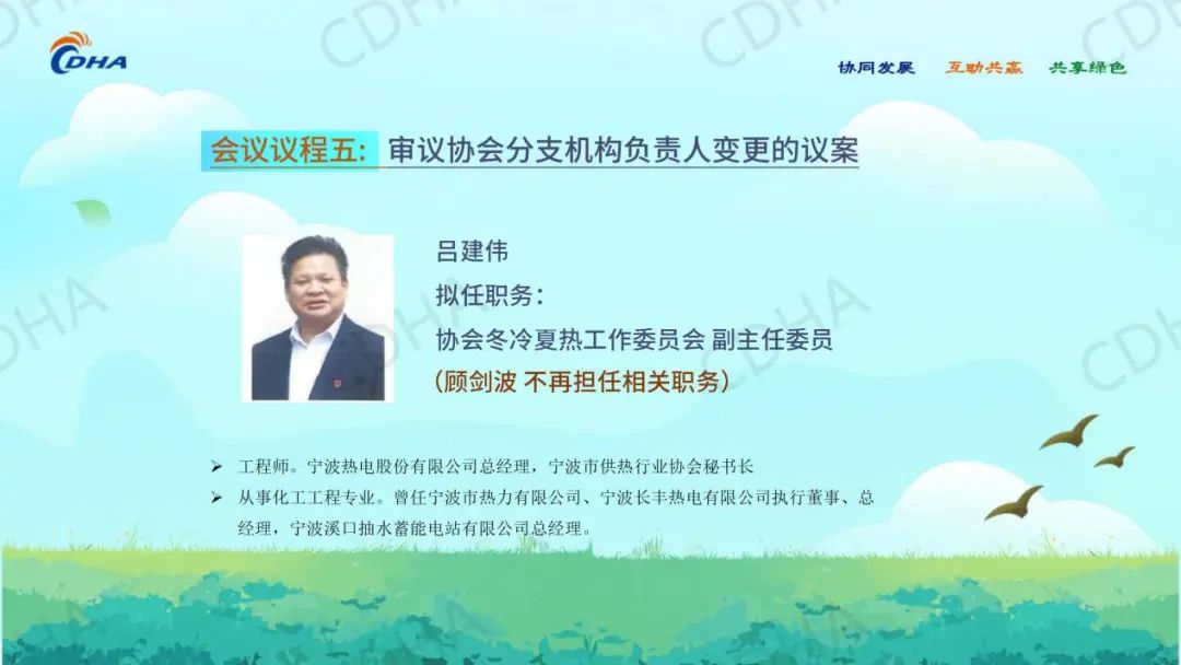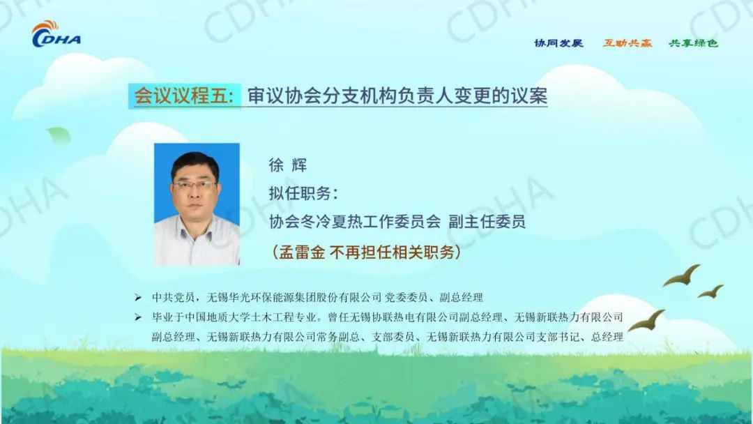 同意宁波市供热行业协会吕建伟同志任冬冷夏热工作委员会副主任委员,无锡华光环保能源集团股份有限公司徐辉同志任冬冷夏热工作委员会副主任委员,合肥热电集团合肥新能热电有限公司安宗保同志任协会冬冷夏热工作委员会秘书长。