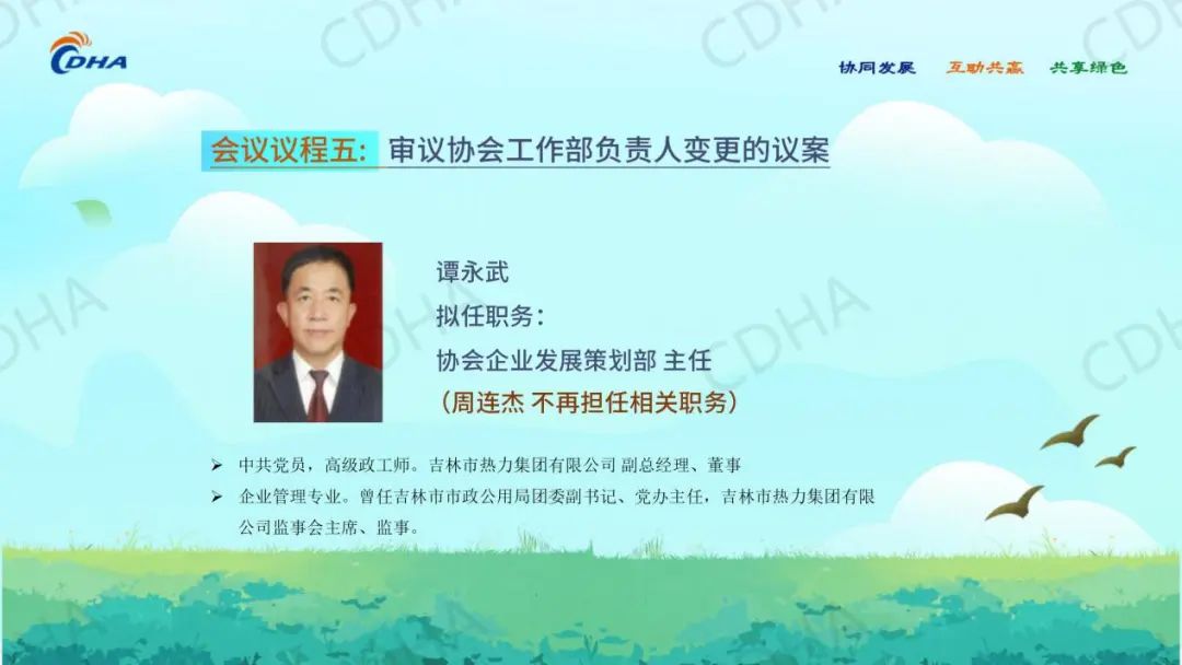 同意吉林市热力集团有限公司谭永武同志任协会企业发展策划部主任。