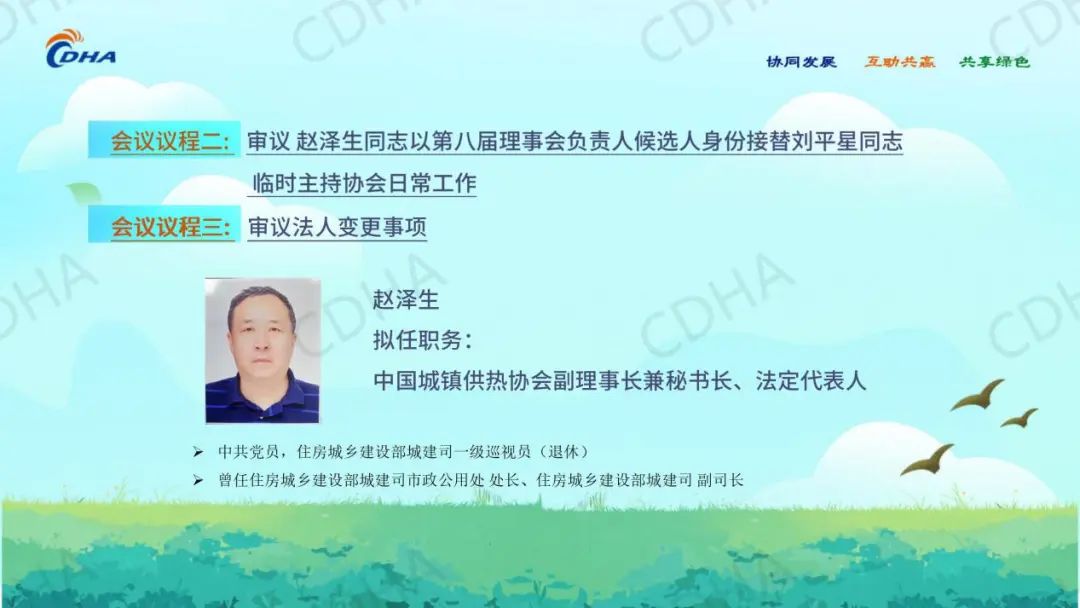 审议赵泽生同志以第八届理事会负责人候选人身份接替刘平星同志临时主持协会日常工作的议案、审议协会法人变更事项