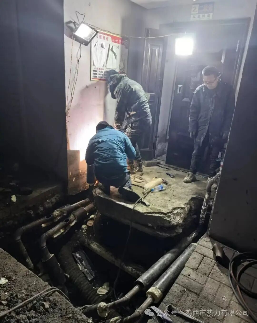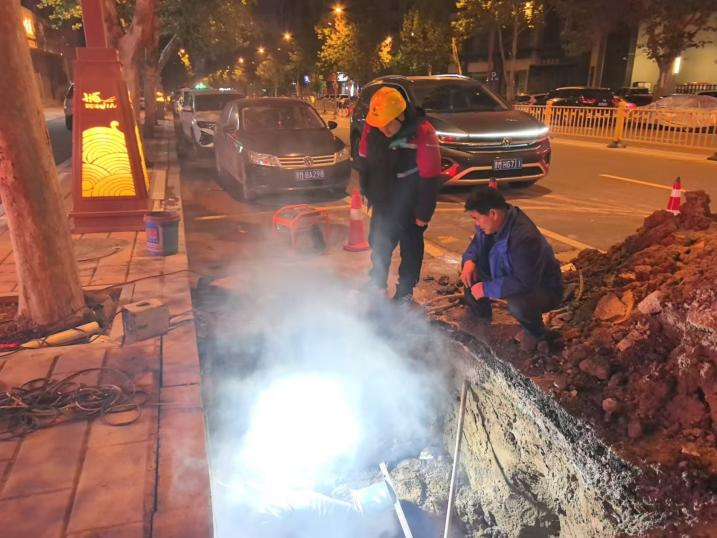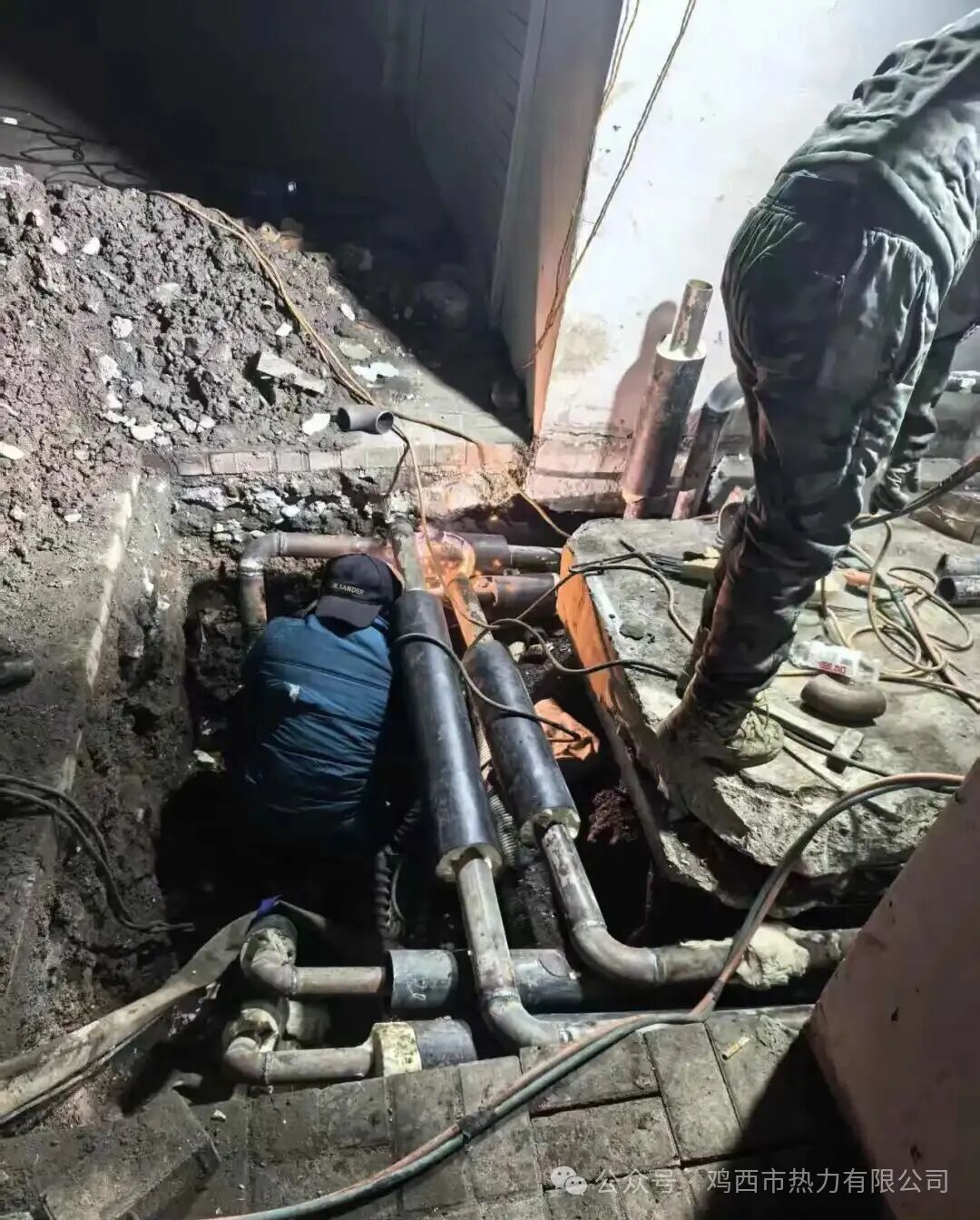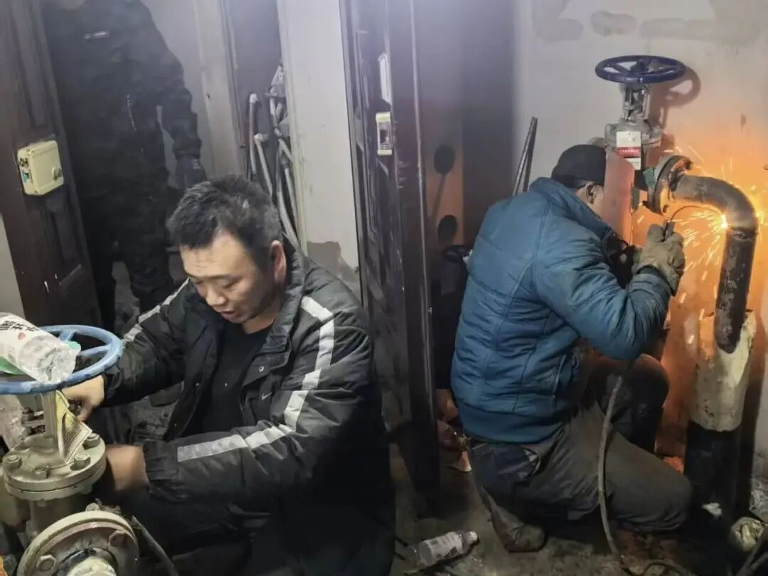 险情就是命令,责任重于泰山。红星分公司生产专员穆广超第一时间赶赴现场,迅速研判险情、科学部署抢修方案。经排查发现漏水点位于地下管网关键节点,老旧管道锈蚀严重,拆除难度极大,且当时气温已降至零下十几摄氏度,寒风刺骨、呵气成霜。红星所所长王浩带领抢修团队闻令而动、火速集结,下午3时许便携带专业工具直奔现场展开攻坚。拆除老化旧管时,队员们需弯腰俯身于狭窄作业坑内,徒手清理管内积水与污垢;铺设新管网焊接作业需精准把控温度与角度,稍不留神便可能影响焊接效果。抢修人员顶风冒寒、分工协作,没有人叫苦叫累,没有人退缩懈怠,始终坚守在抢修一线。从午后暖阳到深夜星光,持续奋战10余小时,他们以“抢时间、保供暖”为核心,用冻得通红的双手攻克一个又一个技术难点,最终在凌晨时分圆满完成新管道更换与打压测试,及时恢复稳定供热。用坚守诠释了“供暖无小事,民生大于天”的责任担当。