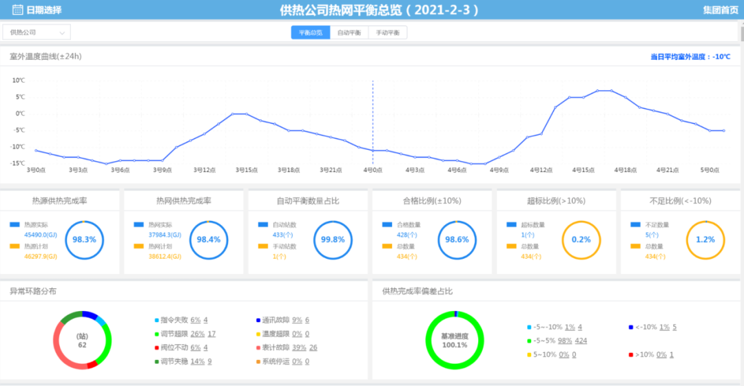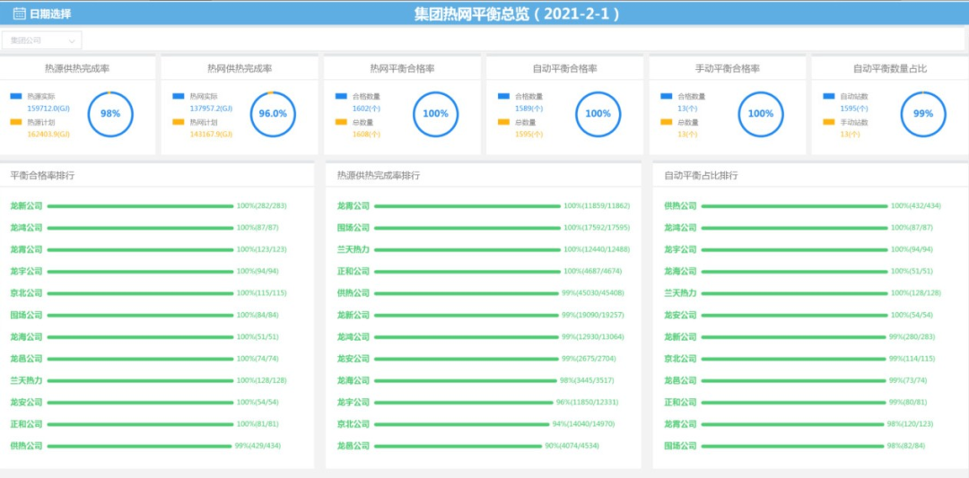 针对常规平衡调控策略存在的上述问题,“启智”研发了全网平衡模块,成功实现了全网自动平衡调控。2020-2021年度运行期,承德热力集团下属12家公司、7200万平方米、1493个换热系统成功投入自动运行,摆脱了人为干预,且平衡合格率几乎可达到100%,真正实现了供热系统自动化、智能化调控。