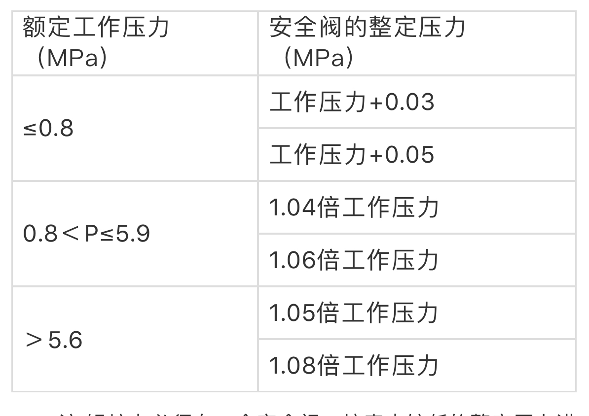 注:锅炉上必须有一个安全阀,按表中较低的整定压力进行调整。对有过热器的锅炉,按较低压力进行调整的安全阀,必须为过热器上的安全阀,以保证过热器上的安全阀先开启。表中的工作压力,对于脉冲式安全阀系指冲量接出地点的工作压力,对其他类型的安全阀系指安全阀装置地点的工作压力。